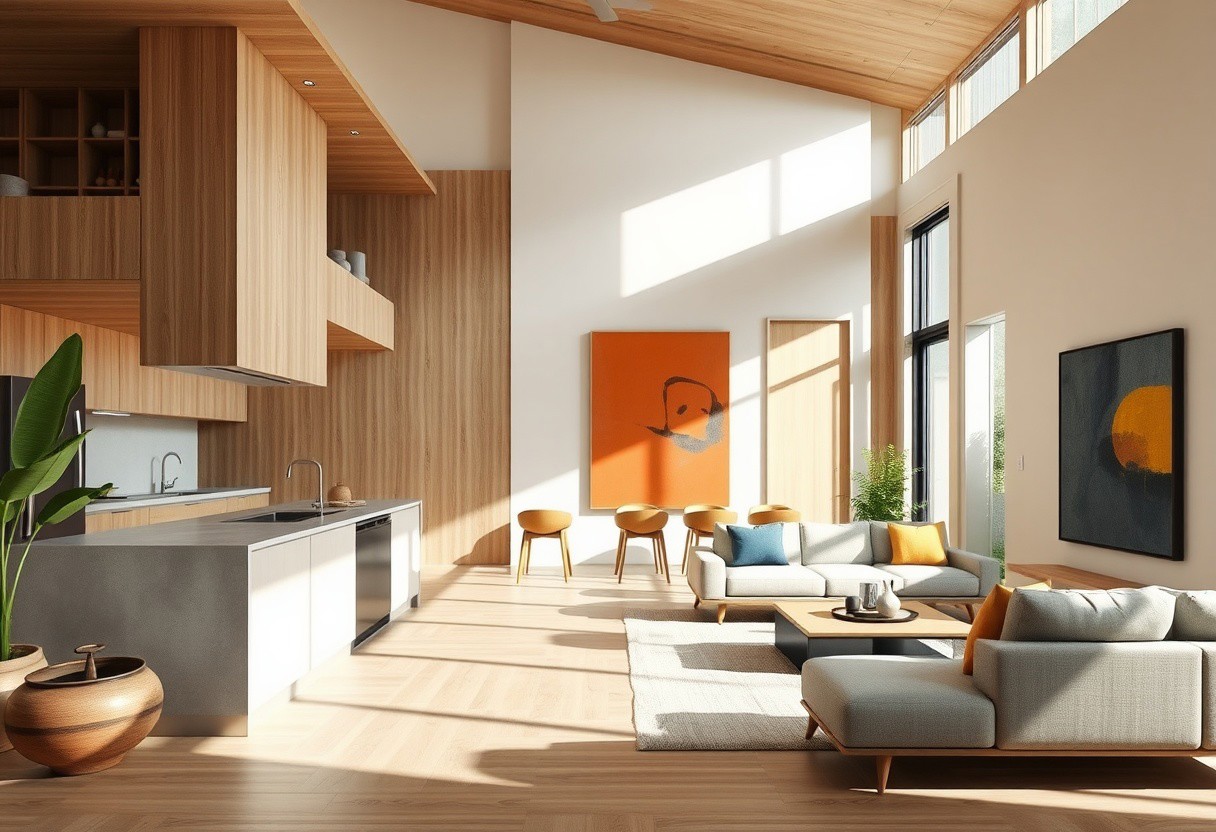 A serene Japandi kitchen and living room interior view, combining tropical elements with modern art movements such as post-painterly abstraction, hard-edge painting, and geometric abstraction. The design emphasizes structural clarity and dynamic composition, blending sculptural forms and geometric accents with a minimalist approach. Clean lines and open spaces enhance the calm atmosphere, while non-representational art introduces a sense of movement and depth. Apply 60-30-10 rule: 60% primary color as light wood and earthy tone, 30% secondary color as light grey, 10% decoration color as mustard yellow, navy blue. The interior integrates natural materials like wood, bamboo, metal, fire, earth, and water. These materials are complemented by bold color fields and sharp-edged geometric forms that reflect the modern art influences. Calligraphy serves as a cultural touchpoint, subtly blending with the non-representational art to maintain the balance between tradition and modernity. Sculptural forms are used to create focal points in the space, drawing attention to the dynamic contrasts between sharp geometric lines and organic materials. Natural light plays a crucial role, casting shadows across the minimalist interior and enhancing the interplay between solid, abstract forms and soft natural textures. The overall design balances simplicity with artistic expression, resulting in a tranquil yet visually stimulating duplex interior that merges tradition with modern art.