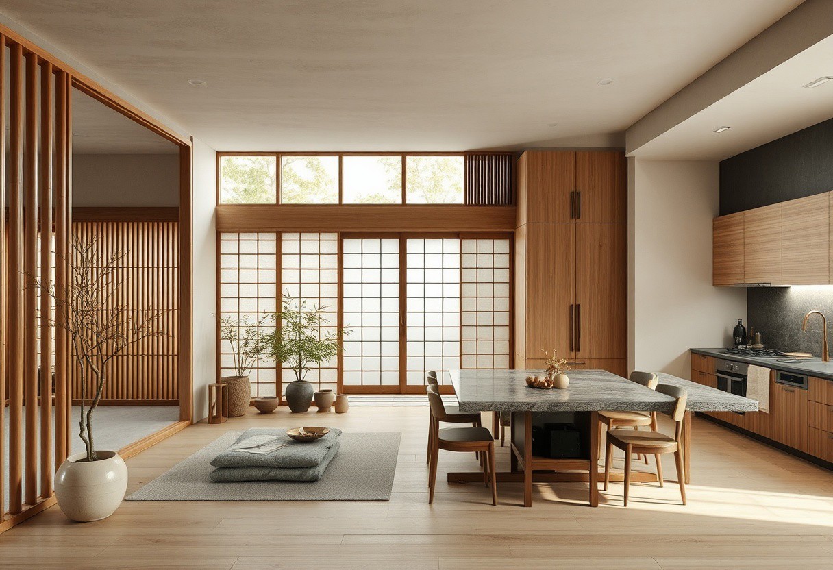 A Wabi-Sabi inspired duplex interior, blending Asian influences in the public room and kitchen, designed to evoke serenity and minimalism. The space features bamboo, stone, and paper elements, with organic shapes creating a natural flow between the rooms. Apply 60-30-10 rule: 60% primary color as dusty grey and dark green, 30% secondary color as beige, 10% decoration coloras brick red, light salmon. Emphasize materials with natural patina, such as aged bamboo and worn stone, celebrating the beauty of imperfection and time’s passage. The interior is tranquil and Zen-inspired, with minimalist decor that allows for open space and calmness. In the public room, paper screens gently filter natural light, creating a soft and warm atmosphere. Incorporate Hanami influences with delicate floral motifs, adding a subtle seasonal touch to the minimalism. The kitchen continues the organic theme with bamboo cabinetry and stone surfaces, maintaining simplicity and functionality. The overall design focuses on residential minimalism, balancing modern comfort with traditional elements, inviting reflection and tranquility in a warm, natural setting.