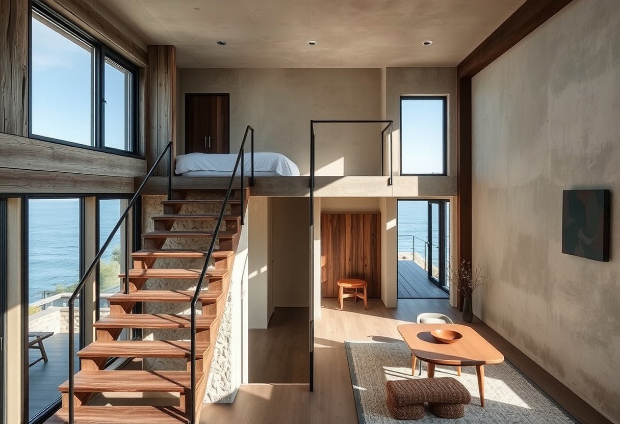 A wabi-sabi inspired single studio interior with the bed on a mezzanine and a public room and kitchen on the ground floor, set against serene seascapes the stairs connect 2 floors. Designed by Dane Taylor Design, the space embraces simplicity, imperfection, and the use of natural materials such as weathered wood, stone, and raw metal. The design celebrates the beauty of asymmetry and the organic aging process of materials, creating a calm, serene atmosphere. Apply 60-30-10 rule: 60% primary color as dusty grey and dark green, 30% secondary color as beige, 10% decoration coloras brick red, navy blue. The open-plan layout allows the seascape to influence the interior, with large windows framing the ocean views and natural light enhancing the beauty of the materials. The light casts gentle shadows across the textured surfaces, emphasizing the imperfections that define the wabi-sabi aesthetic. Asymmetry in the architectural elements adds subtle interest without disrupting the minimalist layout, ensuring the space remains uncluttered and peaceful. Architectural photography captures the harmonious relationship between the interior and the surrounding seascape, focusing on the interplay between the raw, natural materials and the tranquility of the ocean. The seamless transition between the mezzanine bedroom and the ground floor public spaces provides a clear division of function while maintaining a fluid, minimalist design.