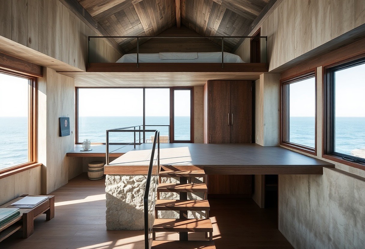 A wabi-sabi inspired single studio interior with the bed on a mezzanine and a public room and kitchen on the ground floor, set against serene seascapes the stairs connect 2 floors. Designed by Dane Taylor Design, the space embraces simplicity, imperfection, and the use of natural materials such as weathered wood, stone, and raw metal. The design celebrates the beauty of asymmetry and the organic aging process of materials, creating a calm, serene atmosphere. The open-plan layout allows the seascape to influence the interior, with large windows framing the ocean views and natural light enhancing the beauty of the materials. The light casts gentle shadows across the textured surfaces, emphasizing the imperfections that define the wabi-sabi aesthetic. Asymmetry in the architectural elements adds subtle interest without disrupting the minimalist layout, ensuring the space remains uncluttered and peaceful. Architectural photography captures the harmonious relationship between the interior and the surrounding seascape, focusing on the interplay between the raw, natural materials and the tranquility of the ocean. The seamless transition between the mezzanine bedroom and the ground floor public spaces provides a clear division of function while maintaining a fluid, minimalist design. reflects the wabi-sabi philosophy of simplicity, imperfection, and natural beauty, creating a peaceful retreat connected to the sea.
