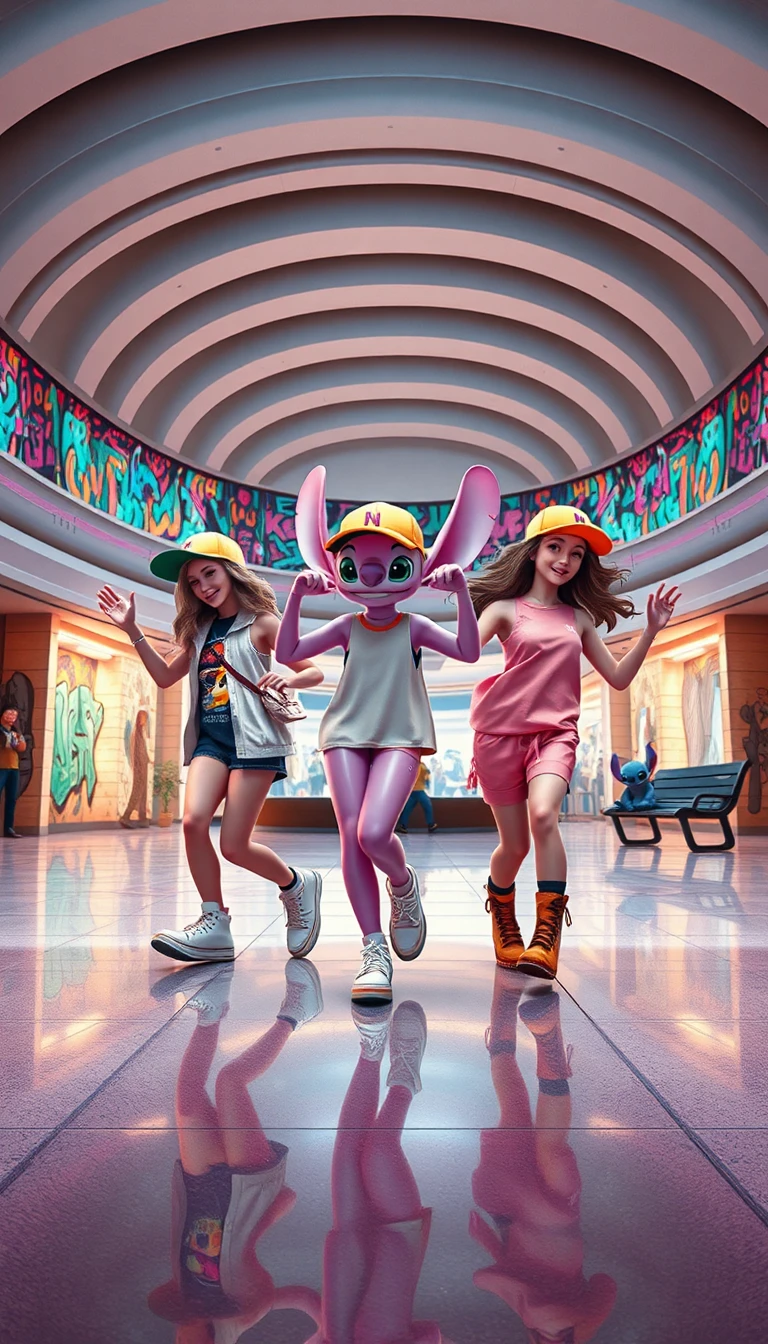 Here’s the updated image prompt for Flux 1.1 with the specific focus on Angel from *Lilo & Stitch*: --- "Create an ultra-realistic, 8K, highly detailed image featuring a 3D rendered Angel from *Lilo & Stitch* (the exact pink version from the movie) in the middle of a large, circular-shaped mall. The mall has a modern, futuristic design with walls covered in vibrant, abstract street art graffiti. Angel is accompanied by two female friends, all dressed in trendy 2024 outfits, each wearing trucker hats, but with no visible clothing logos or brands. The trio is captured mid-dance, moving in perfect sync. The outfits are streetwear-inspired, colorful, and fashionable, with soft lighting reflecting off the glossy mall floor, emphasizing the energy of their dance. In the background, sitting on a bench further away, Stitch, also 3D rendered in his usual urban clothing with a trucker hat, watches them dance with an amused expression. The mall scene is lively, with abstract figures in the background, but the focus remains on the characters. Every detail is rendered with ultra-high realism, creating a dynamic, energetic vibe." --- This prompt ensures the 3D render matches the *Lilo & Stitch* characters exactly, with the rest of the scene providing a modern, vibrant backdrop.