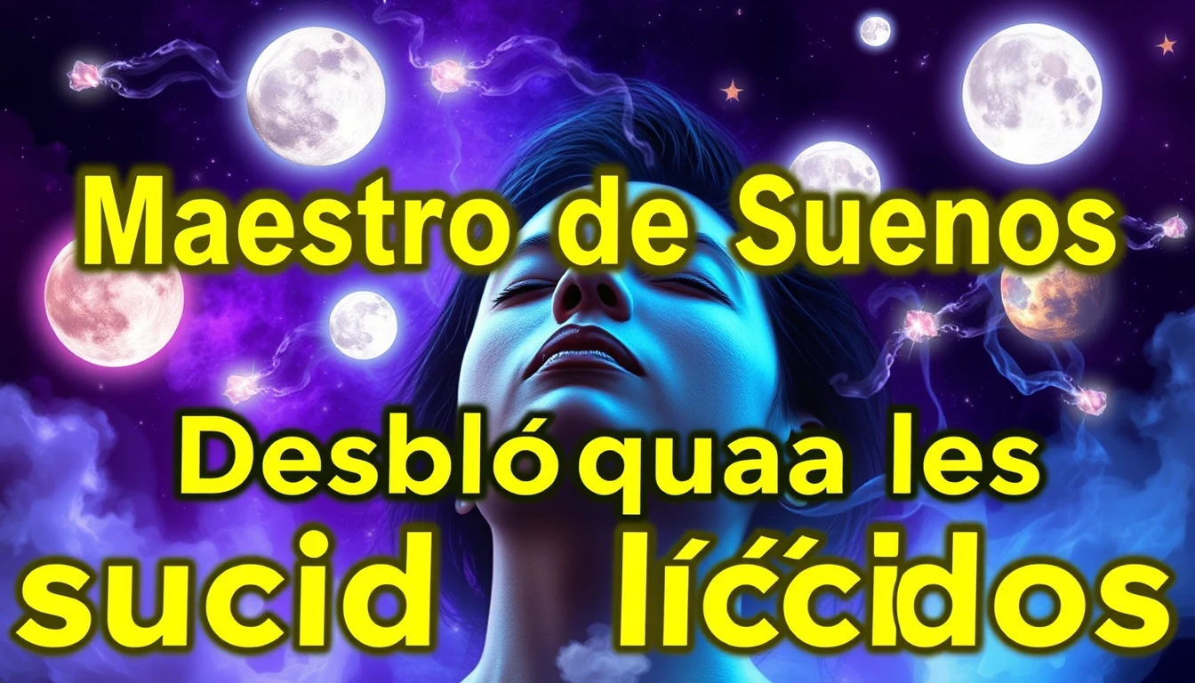 Create a YouTube thumbnail about lucid dreaming that captures the magical and transformative essence of controlling your dreams. The thumbnail should feature a dreamy, surreal background with vivid colors, like deep purples and blues, suggesting a night sky or cosmic landscape. Include a person with their eyes closed, surrounded by swirling, ethereal lights or mist, to evoke a sense of mysticism. Incorporate visual elements that hint at dream manipulation—such as floating objects, multiple moons, or portals opening into different worlds. The title text should be bold and eye-catching, using phrases like 'Maestro de Sueños' or 'Desbloquea los sueños lúcidos,' in a neon or glowing font. Make sure the thumbnail conveys intrigue, wonder, and empowerment, inviting viewers to explore the limitless possibilities of lucid dreaming.