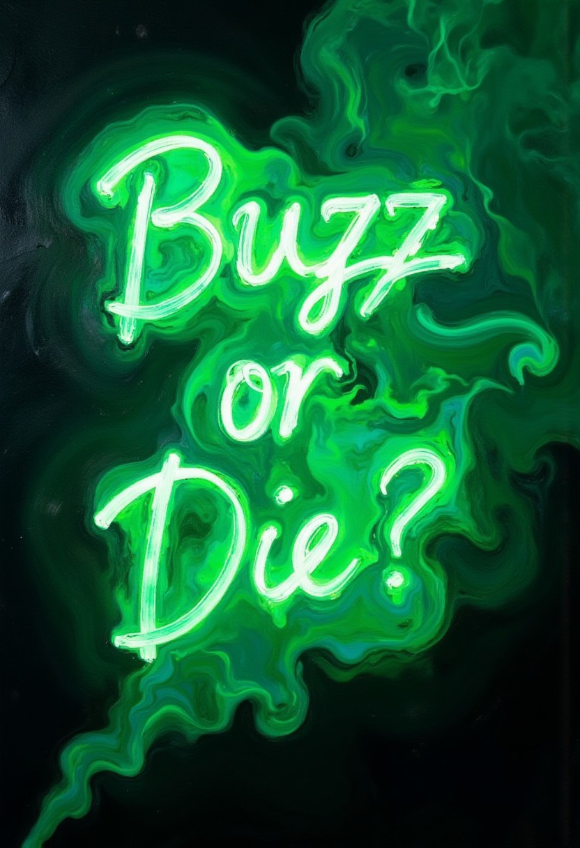 A painting of a phrase comprised of green neon smoke, which reads in attractive artisanal cursive, "Buzz or Die?"