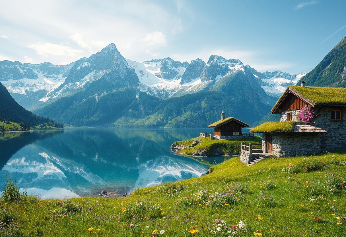 Ultra realism, high quality, high resolution 8K and above, stable and accurate focus, ultra correct anatomy, super detail. A beautiful mountain scene with tall snow-capped peaks reflected in a crystal clear lake. In the foreground are green meadows dotted with wild flowers of various colors. Included in the landscape are houses built of stone and wood, architecturally designed to blend in with nature. The roofs of the houses are covered with thick grass and flowers