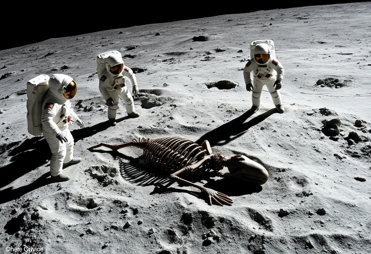 NASA astronauts have found an alien skeleton under the surface of the moon. Three astronauts can be seen in the picture.