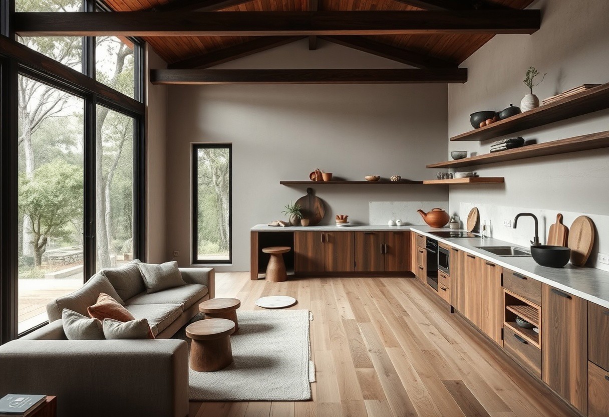 A Wabi-Sabi inspired garden house living room and kitchen, designed by Annabell Kutucu, reflecting serene minimalism. The kitchen features a rich palette of paired with natural, raw materials like unfinished wood, worn leather, and natural linen. Open space with trees. Apply 60-30-10 rule: 60% primary color as taupe and deep brown, 30% secondary color as austerer black, 10% decoration coloras brick red, pale cyan. The monochromatic color scheme enhances the simplicity, while the raw, organic textures emphasize the beauty of imperfection. Soft, natural light filters through the space, casting gentle shadows on the rich wood surfaces and leather accents, creating a tranquil, almost meditative atmosphere. The minimalist design prioritizes functionality, with open shelving, simple stone countertops, and handcrafted elements adding subtle detail. Each material brings its own texture and tactile sensation, while the austere blacks and warm browns create a balance of depth and warmth. The kitchen’s layout is simple, spacious, and clutter-free, celebrating the Wabi-Sabi philosophy of beauty in simplicity.