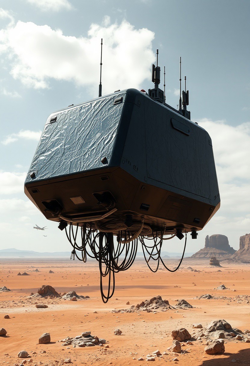 ultra high resolution, masterpiece, best quality, small featureless angular glossy black spacecraft with a heavily textured surface hovering low to the ground, underneath the spacecraft are cables hoses and wires, antennas on top, cables hanging from below, rectangular in shape, futuristic world, post apocalyptic landscape, anti gravity, in the atmosphere, sky, clouds, ground visible, hovering, dry desert, rocky outcroppings