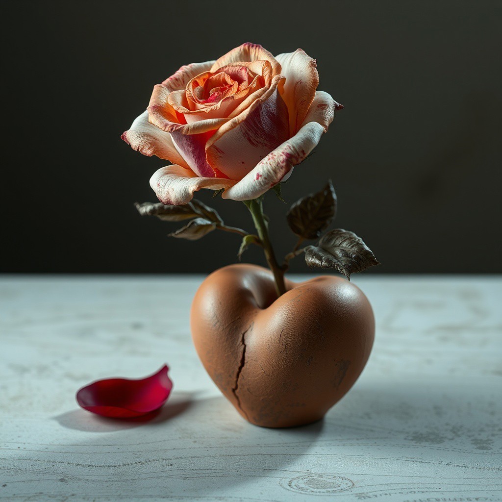 high-resolution digital artwork featuring a single dead rose, its colour bleached out with age, its leaves dry and brown, its stem wilted, It stands in a clay, heart shaped cracked vase, the vase has a large crack. a single red petal lies on the table next to it,