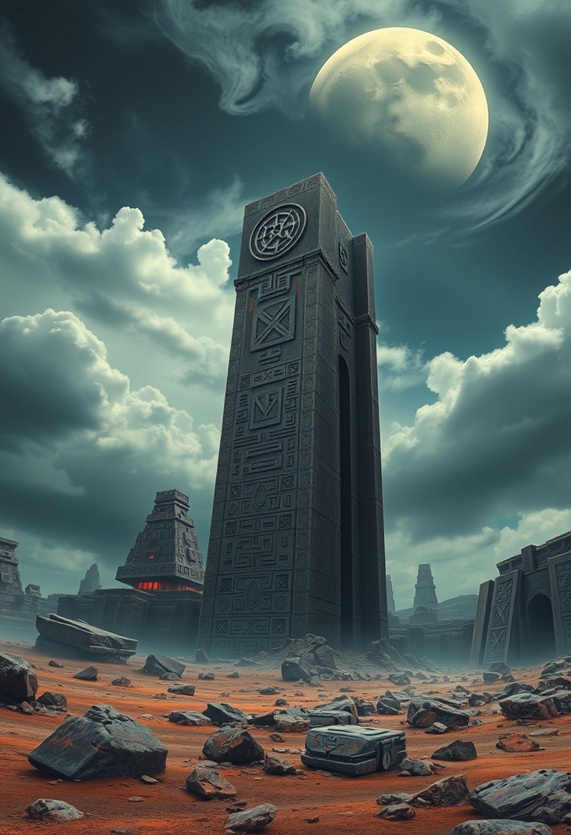 Image is a digital artwork depicting a surreal, otherworldly landscape. The central focus is a massive, monolithic structure resembling a weathered stone tower, intricately carved with geometric patterns and symbols. The tower stands amidst a barren, rocky terrain under a dramatic sky filled with swirling clouds. In the background, a large, partially obscured celestial body, possibly a moon or planet, looms over the horizon, adding to the scene's mysterious and alien atmosphere. The colour palette is dominated by earthy browns and greys, with subtle highlights of orange and blue, creating a sense of depth and scale. The overall composition is balanced, with the tower slightly off-centre, drawing the viewer's eye upward towards the sky and celestial body.