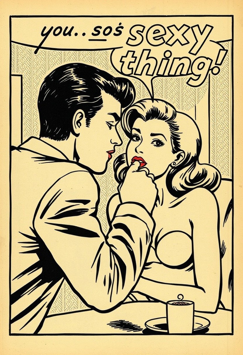 norman rockwell style, hot chocolate comic strip in panels, aged pages, crude drawing, fumetti tijuana bible text: "you sexy thing"