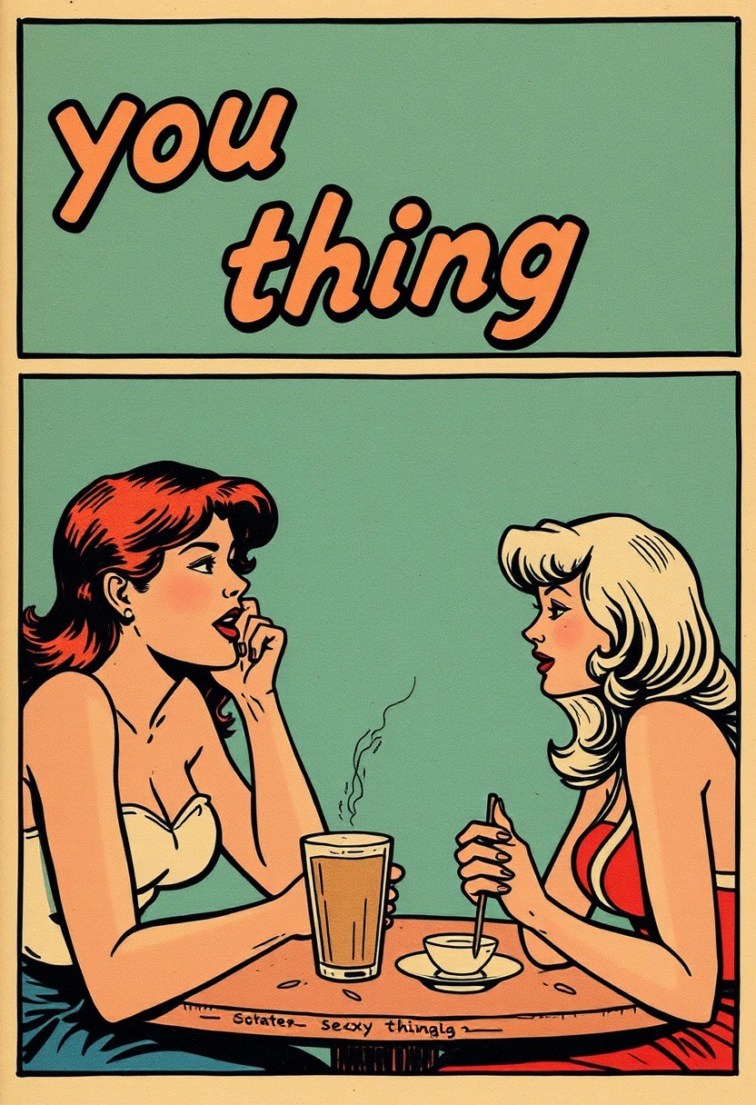 norman rockwell style, hot chocolate comic strip in panels, aged pages, crude drawing, fumetti tijuana bible text: "you sexy thing"