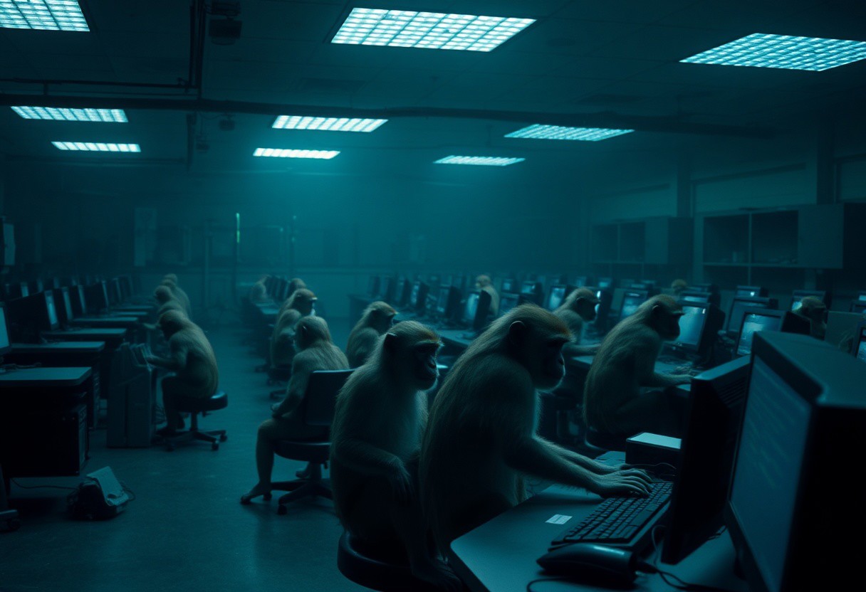 a large darkly lit room in a research facility where dozens of monkeys sit behind computers programming,dim,loomy,hyperrealistic