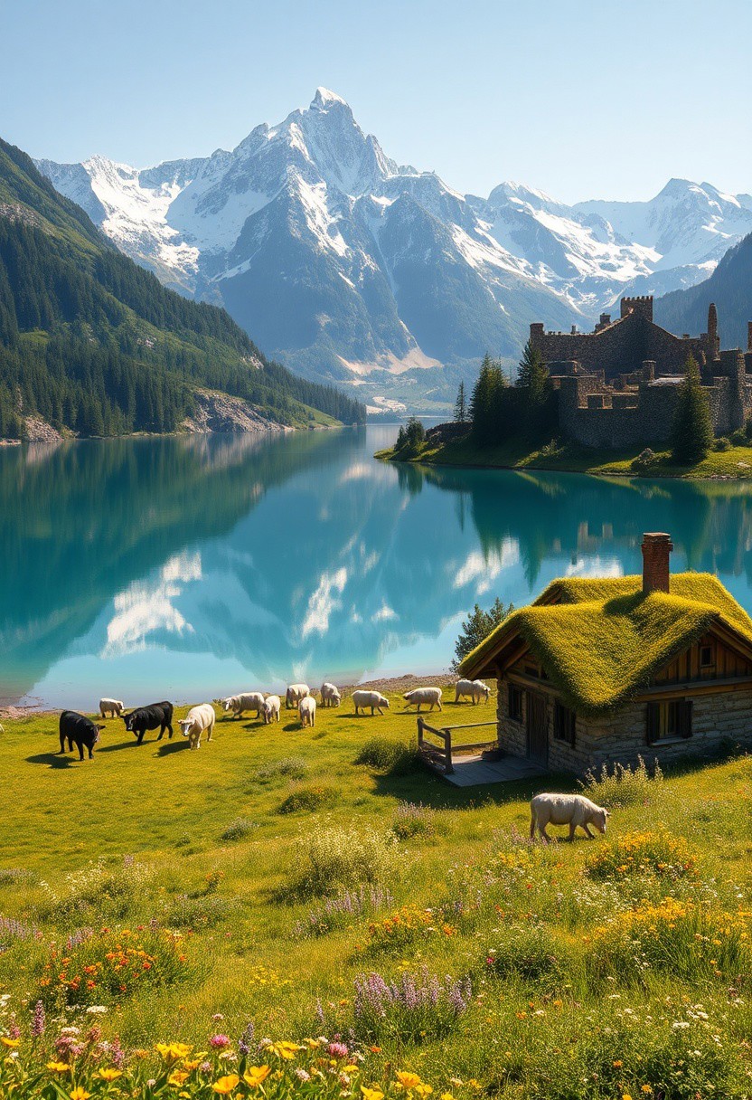 Ultra realism, high quality, high resolution 8K and above, stable and accurate focus, ultra correct anatomy, super detail. A beautiful mountain scene with tall snow-capped peaks reflected in a crystal clear lake. In the foreground are green meadows dotted with wild flowers of various colors. Included in the landscape are houses built of stone and wood, architecturally designed to blend in with nature. The roofs of the houses are covered with thick grass and colorful flowers. Cows roam the meadow, and a flock of sheep, led by shepherd dogs, graze around. The trees around the houses are tall and green, with leaves that cast shadows on the houses.((The ruins of an ancient fortress can be seen in the distance, giving the scene historical depth)). The sunlight illuminates the landscape, creating a warm and welcoming atmosphere.