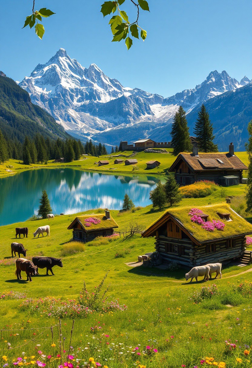 Ultra realism, high quality, high resolution 8K and above, stable and accurate focus, ultra correct anatomy, super detail. A beautiful mountain scene with tall snow-capped peaks reflected in a crystal clear lake. In the foreground are green meadows dotted with wild flowers of various colors. Included in the landscape are houses built of stone and wood, architecturally designed to blend in with nature. The roofs of the houses are covered with thick grass and colorful flowers. Cows roam the meadow, and a flock of sheep, led by shepherd dogs, graze around. The trees around the houses are tall and green, with leaves that cast shadows on the houses.((The ruins of an ancient fortress can be seen in the distance, giving the scene historical depth)). The sunlight illuminates the landscape, creating a warm and welcoming atmosphere.