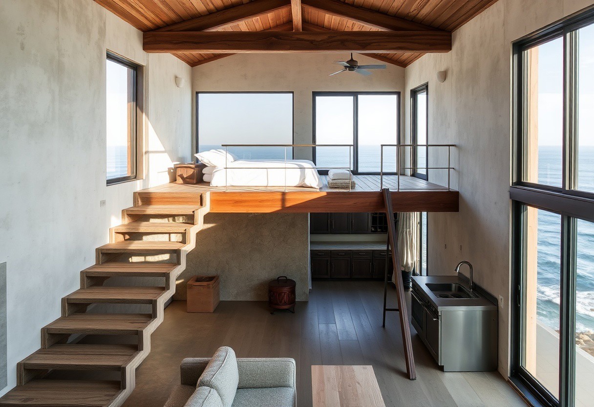 A wabi-sabi inspired single studio interior with the bed on a mezzanine and a public room and kitchen on the ground floor, set against serene seascapes the stairs connect 2 floors. Designed by Dane Taylor Design, the space embraces simplicity, imperfection, and the use of natural materials such as weathered wood, stone, and raw metal. The design celebrates the beauty of asymmetry and the organic aging process of materials, creating a calm, serene atmosphere. The open-plan layout allows the seascape to influence the interior, with large windows framing the ocean views and natural light enhancing the beauty of the materials. The light casts gentle shadows across the textured surfaces, emphasizing the imperfections that define the wabi-sabi aesthetic. Asymmetry in the architectural elements adds subtle interest without disrupting the minimalist layout, ensuring the space remains uncluttered and peaceful. Architectural photography captures the harmonious relationship between the interior and the surrounding seascape, focusing on the interplay between the raw, natural materials and the tranquility of the ocean. The seamless transition between the mezzanine bedroom and the ground floor public spaces provides a clear division of function while maintaining a fluid, minimalist design. reflects the wabi-sabi philosophy of simplicity, imperfection, and natural beauty, creating a peaceful retreat connected to the sea.