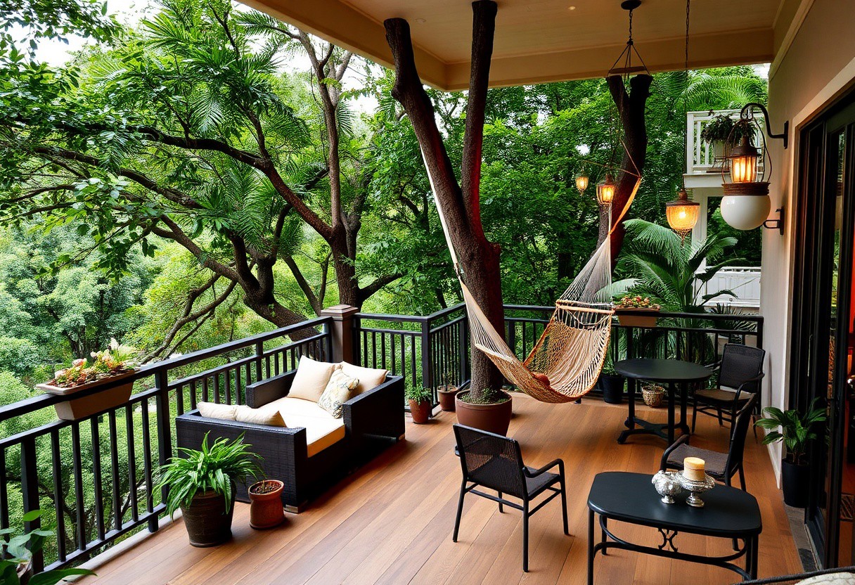 "An inviting outdoor space showcasing a spacious balcony overlooking a lush landscape. The balcony, adorned with elegant railings, features a cozy seating area with weather-resistant furniture, perfect for enjoying morning coffee or evening gatherings. Lush green trees surround the area, providing a natural canopy that offers both shade and a sense of tranquility. Potted plants and hanging planters add splashes of color and life, enhancing the tropical atmosphere. A comfortable hammock is suspended between two sturdy trees, inviting relaxation and lazy afternoons spent reading or napping in the gentle breeze. The outdoor flooring, crafted from natural wood or stone, harmonizes with the surrounding environment, while decorative outdoor lights create a warm ambiance for evening use. A small outdoor dining area, with a table and chairs, is perfect for al fresco meals, providing an intimate setting amidst nature. The space is designed to seamlessly blend indoor and outdoor living, allowing for an open flow that encourages appreciation of the lush surroundings, making it an ideal retreat for relaxation and socializing."