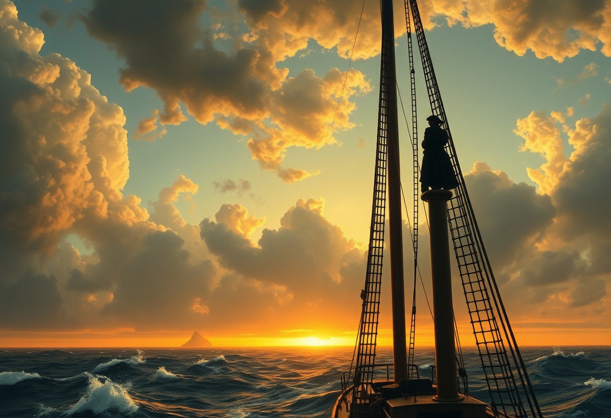 , realistic, long shot, gothic painting style middle of the sea, sails, a pirate man atop a ship's crow's nest looking at the distance gazing over the vast ocean, spotting a island in the distance clouds, sunset, turbulent waves, adventure, cinematic lighting, By Caspar David Friedrich