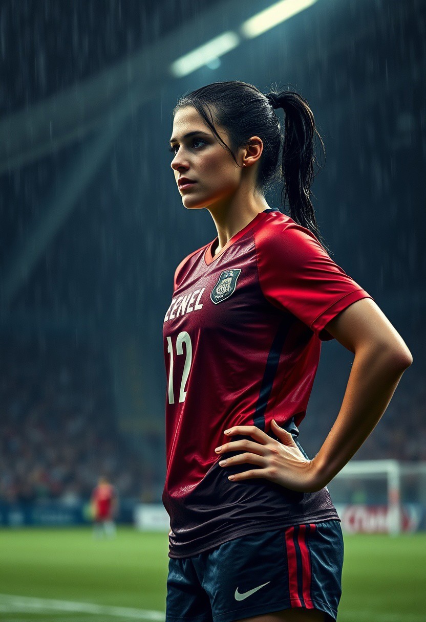 A photorealistic portrait of an athletic German female, 25 years old. She has black hair, tied back. She is playing soccer in a dark, wet stadium. She is soaking wet though both sweat and rain, her face is red through exertion. It is towards the the end of the game, she is stood with her hands on her hips