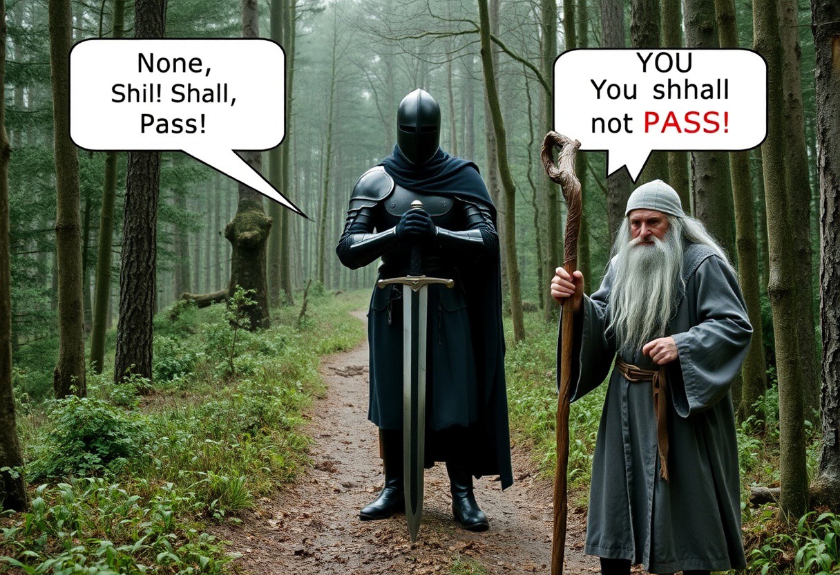 A realistic photo in the style of grainy 1970s movies, The Black Knight from Monty Python stands in the middle of a narrow forest trail, he's resting his hands on the pomel of a two-handed long-sword planted in the ground, blocking the path. He is stoic and unmoving. A speech bubble above the knight reads "None. Shall. Pass.". A speech bubble below the knight reads "None! Shall! Pass!" On the trail facing the Knight is Gandalf, an old wizard with long gray hair and a long gray beard wearing battered gray robes and and a weathered gray wizard hat, he's holding a twisted and gnarled wooden staff as tall as he is. Above gandalf's head is a speech bubble that reads "YOU shall not pass!" Below him is a speech bubble that reads "You shall not PASS!"