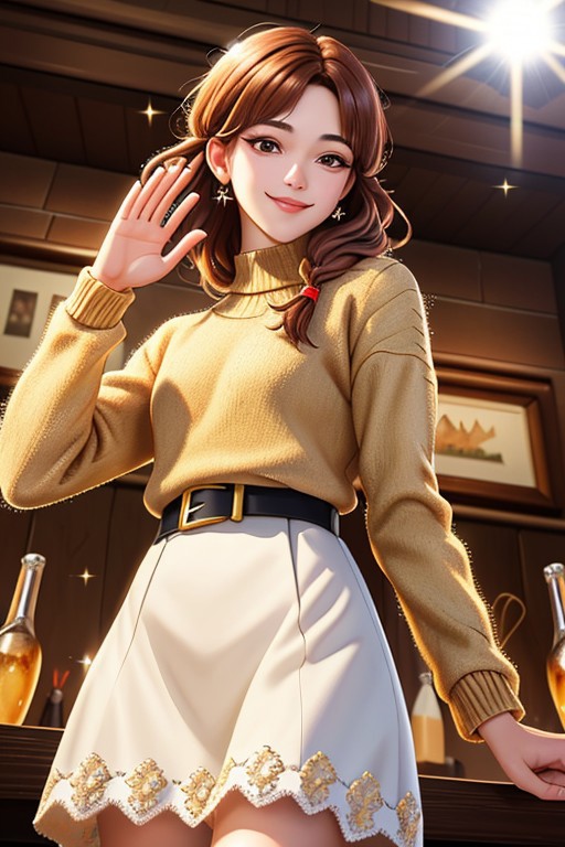 Masterpiece, best quality, realistic, 1girl, tomie kawakami, (face focus:1.4), red (french braid:1.2), santa claus outfit, (intricate lace:1.1), art by Style-Empire, art by Style-Empire, small breasts, cleavage, (from below:1.2), (cowboy shot:1.3), (medieval tavern:0.9), art by Style-Tavern, (bloom:1.1), (light sparkles:1.2), (chromatic aberration:1.0), (shallow depth of field:1.3), (lens flare:1.2), looking at viewer, (dutch angle:1.0), perfect feminine face, (volumetric lighting:1.0), (detailed:1.0), (photorealistic:1.0), digital painting, (sharp:1), (realistic:1.0), cleavage,smile, say hello, hand up and waving,