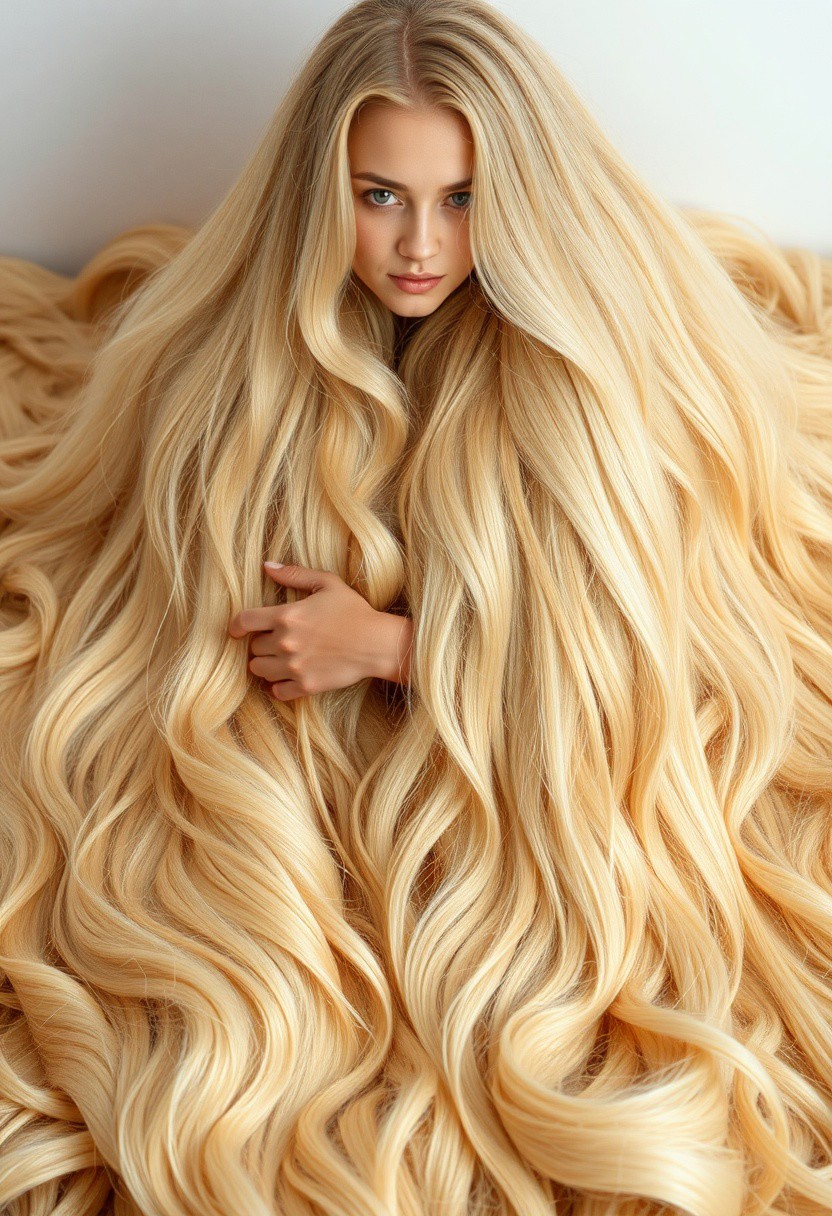 buried in a mound of luxuriant incredible thick abundant voluminous lush sensuous extremely long pale golden blonde hair wrapped around the body. extremely long hair, 100-feet of hair, super long hair, real rapunzel, rapunzel, rapunzel long hair, hair fetish, hair job, Dreamgirl, Goddess, gorgeous, amazing hair, longest hair, perfect hair, longest hair ever, hairstyles, hairstyling, hair, Debra Jo hair, extreme hair, extreme long hair, extremely long hair, Debra Jo, extreme longest hair, voluminous hair, thick and luxurious hair which is hangs to the floor and covers it. Her expression radiates confidence as she shows off her thick, luscious locks. super thick soft luxurious long lush sleek heavy voluminous cascading pendulous ultra silky pendulous shampoo commercial hair dragging the ground, around her on floor, hair piles behind her on floor