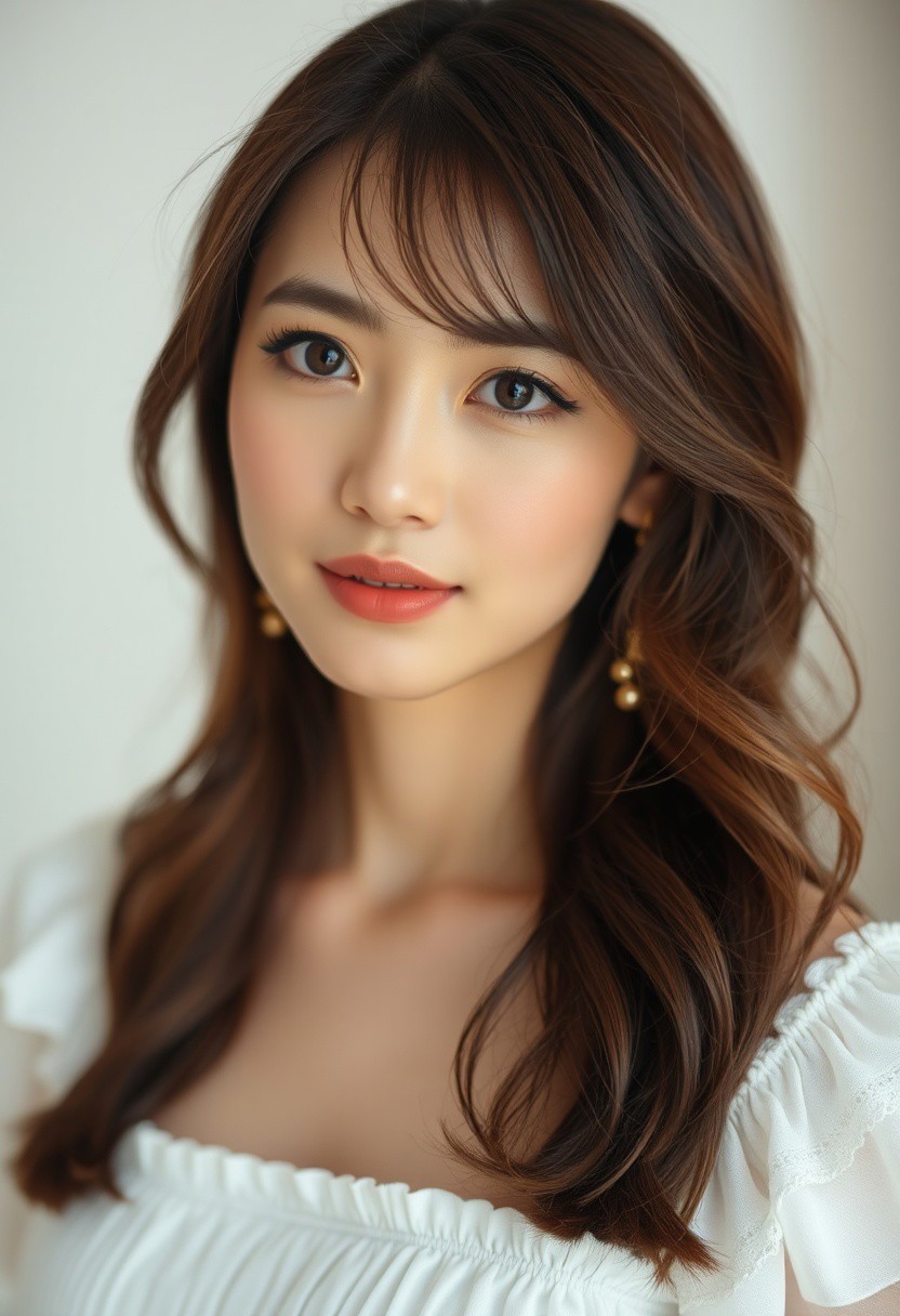 txw ,,best quality, masterpiece, raw photo of a female in white dress, close up face, brown hair, fashion accessories, looking at viewer, indoor, day time, professional photo, high contrast exposure, soft bokeh, high key light, hard shadow, soft bokeh, simple background, white background,und, white background,