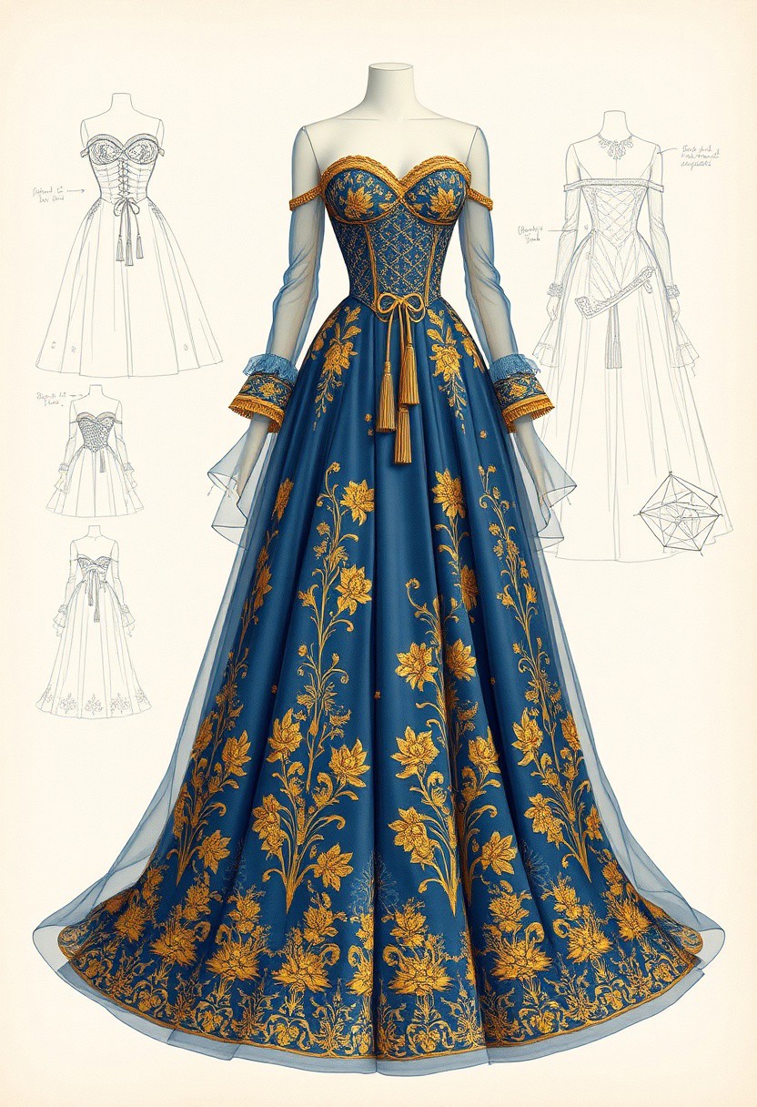 The design shown in the image features a majestic, flowing gown with intricate golden floral embroidery on a sheer blue fabric. The gown has a corset-style bodice with a sweetheart neckline, accented with delicate tassels draping from the waist. The layered skirt fans out, adding volume, while the embroidery continues to the hem. The sketches in the background suggest meticulous craftsmanship and attention to detail in the gown's structure, with diagrams showcasing its various angles and embellishments.