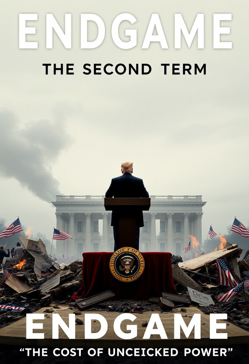 a movie poster for the movie Titled: "Endgame: The Second Term" Trump standing on a broken podium, surrounded by ruins of the Constitution, with scattered protest signs and burning flags. "The cost of unchecked power."