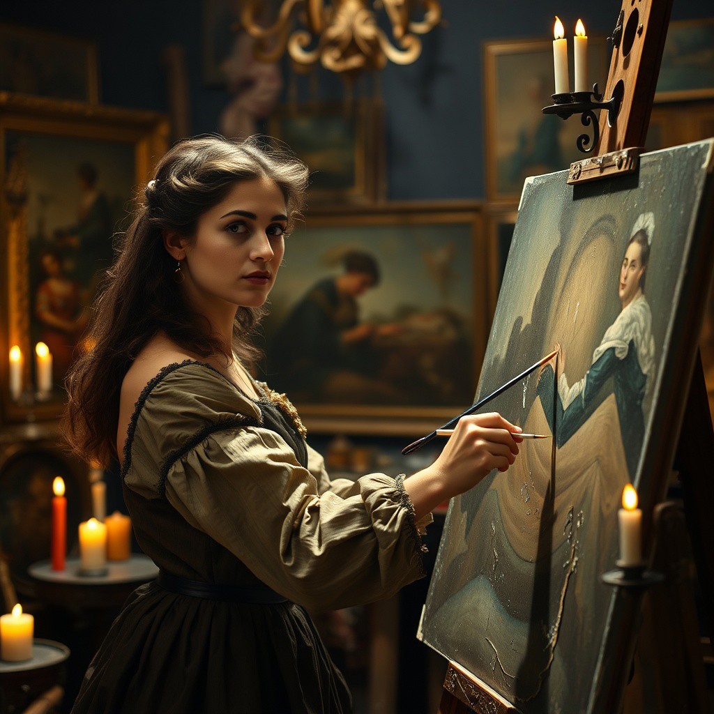 Reneissance painter woman painting in her 18th century art studio which is dimly lit by candles. she has determined look and moving her paintbrush across canvas, her studio is full of different finished and unfinished paintings, masterpiece, dramatic light.
