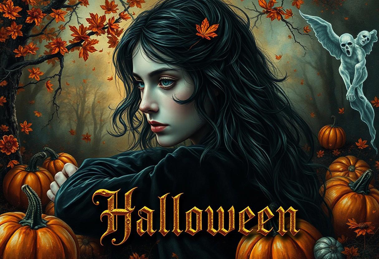 masterpiece, a painting made of precious stones, full body shot, score_9, score_8_up, score_7_up, (best quality:1.1),ultra-detailed, high resolution, super detailed , cinematic, hyperrealistic, Therese, the watchful guardian, her silence ever near Jeanette, a haunting melody, her voice you always hear, Halloween, pumpkins, ghosts, autumn, Gothic font text: "Halloween"