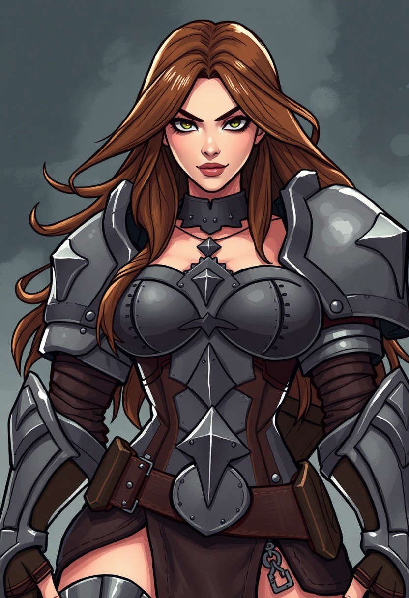 a woman with long hair and large breasts wearing a heavy armor, in combat cartoon style