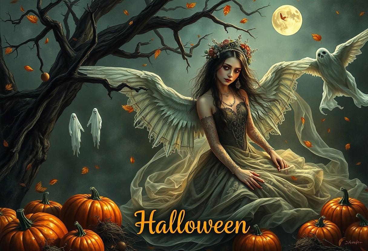masterpiece, a painting made of precious stones, full body shot, score_9, score_8_up, score_7_up, (best quality:1.1),ultra-detailed, high resolution, super detailed , cinematic, hyperrealistic, Therese, the watchful guardian, her silence ever near Jeanette, a haunting melody, her voice you always hear, Halloween, pumpkins, ghosts, autumn, bow text: "Halloween"