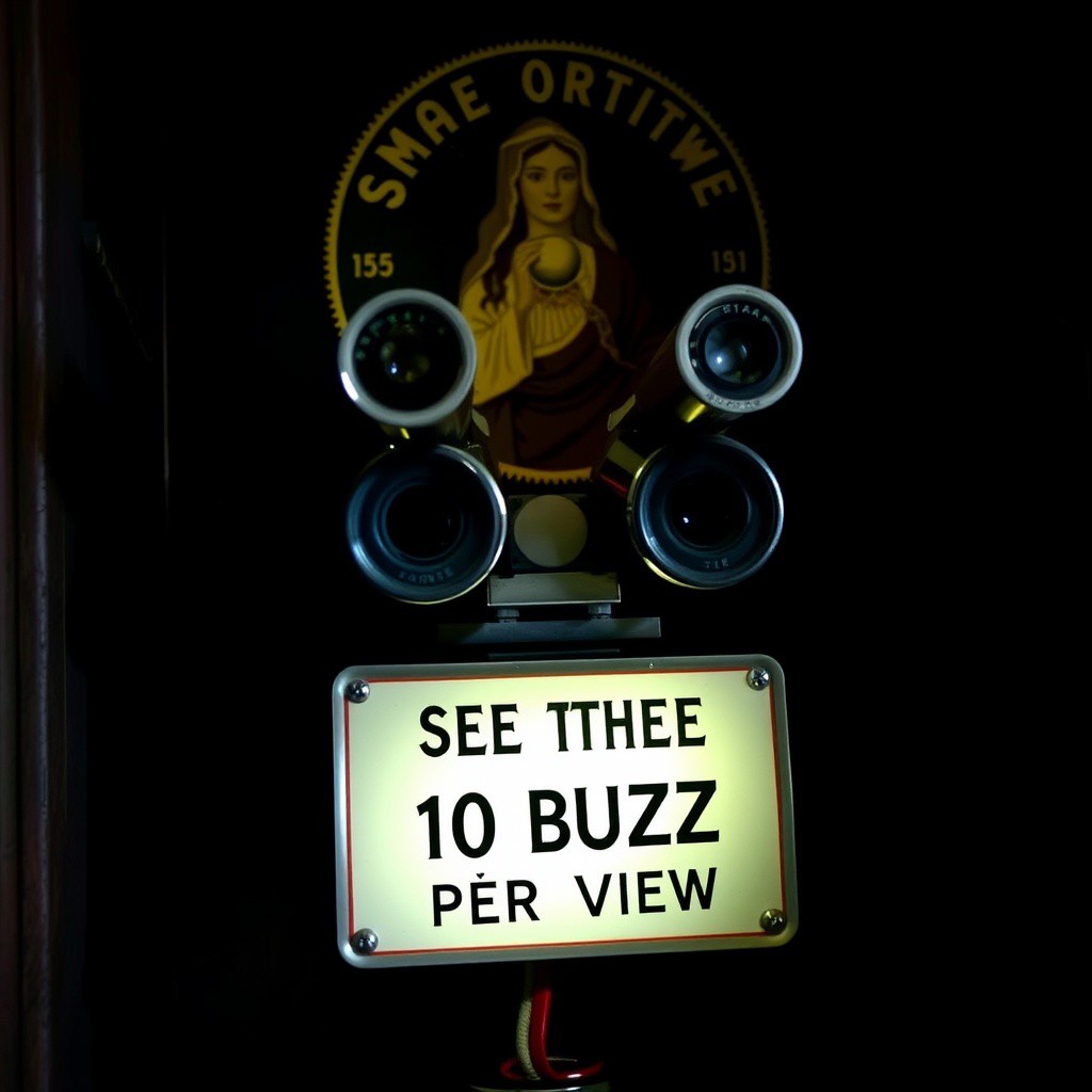 A coin operated stereo telescope binocilars in closed dark room with sign decorated with image of a female oracle holding crystal ball and text "SEE THE FUTURE" and "10 BUZZ PER VIEW"