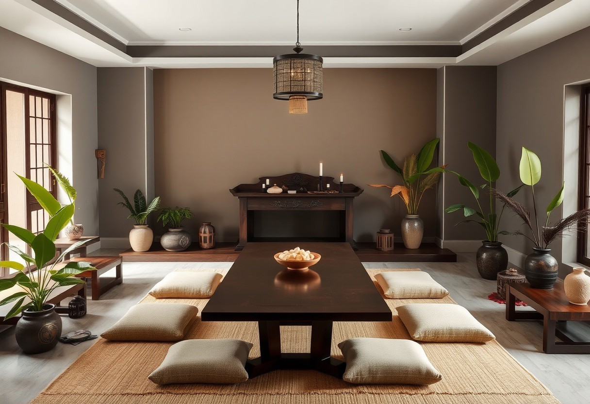 "A tranquil ritual room blending Modern Wabi Sabi and Tropical Modern styles. The walls are painted in dusty gray and accented with taupe for a calm, neutral backdrop. At the center, a handcrafted deep brown altar with subtle carvings serves as the focal point, holding incense burners, white candles, and ancestral tablets to create a sacred atmosphere. Behind the altar stands a traditional dark wood dining table, seating 8-12 for family gatherings and rituals. The table’s elegant simplicity complements the natural textures and forms the heart of ceremonial activities. Surrounding the table, low wooden benches and soft beige floor cushions encourage family participation, bringing warmth and comfort to the space. Lime green and dark green tropical plants, placed in simple ceramic vases, bring vibrant touches of nature, while woven textiles in earth tones and light beige add depth and texture. A woven rug under the altar enhances the room’s tactile warmth. Soft ambient lighting from lanterns casts gentle shadows, fostering a meditative atmosphere. Accents of light salmon, pale cyan, and brick red are subtly integrated through decor elements, adding contrast without overwhelming the serene environment. The room combines Wabi Sabi’s natural imperfections with the vibrant energy of Tropical Modern, offering a sacred and harmonious space for honoring family traditions."