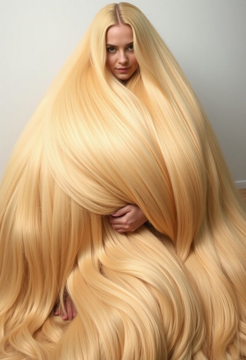 buried in a mound of luxuriant incredible thick abundant voluminous lush sensuous extremely long pale golden blonde hair wrapped around the body. extremely long hair, 100-feet of hair, super long hair, real rapunzel, rapunzel, rapunzel long hair, hair fetish, hair job, Dreamgirl, Goddess, gorgeous, amazing hair, longest hair, perfect hair, longest hair ever, hairstyles, hairstyling, hair, Debra Jo hair, extreme hair, extreme long hair, extremely long hair, Debra Jo, extreme longest hair, voluminous hair, thick and luxurious hair which is hangs to the floor and covers it. Her expression radiates confidence as she shows off her thick, luscious locks. super thick soft luxurious long lush sleek heavy voluminous cascading pendulous ultra silky pendulous shampoo commercial hair dragging the ground, around her on floor, hair piles behind her on floor