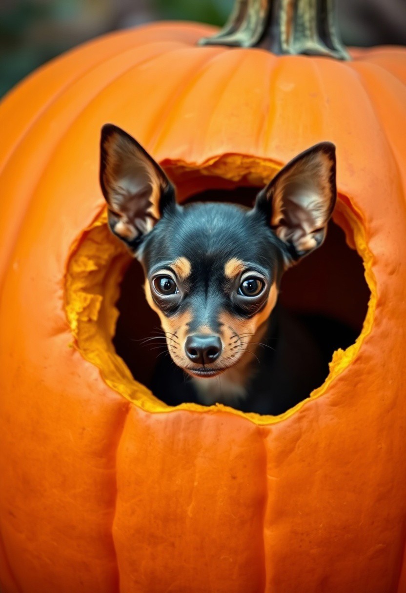 Miniature Pinscher in a giant punpkin, Shy Miniature Pinscher. The miniature Pinscher is barely visible, only his head are partially out of a hole in the pumpkin. Full pumpkin