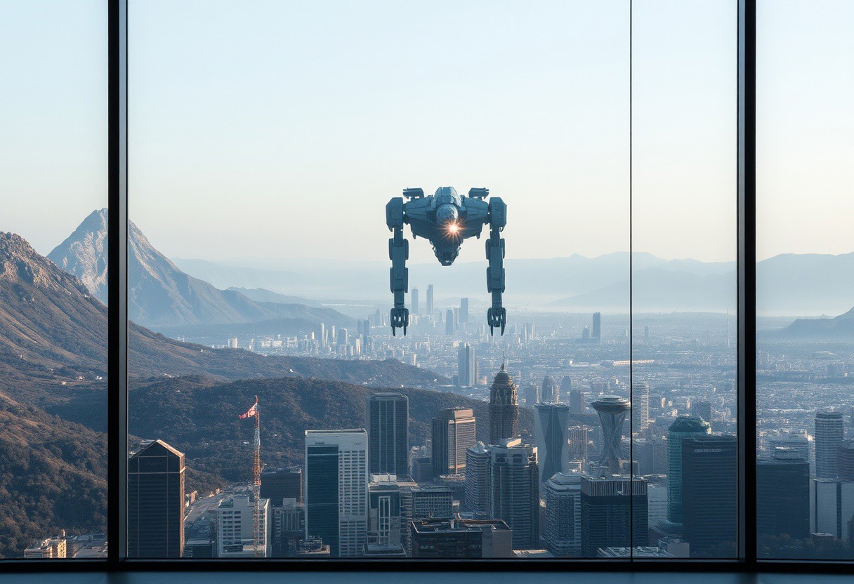 view through a panorama window wall, overlooking the edge of a modern city against a hillside landscape with a mountain peak on either side, between the mountains on the hazy horizon emerges an omnious mecha reminiscent of the jaeger model from the movie pacific rim, the mecha fires its laser cannon into the distance