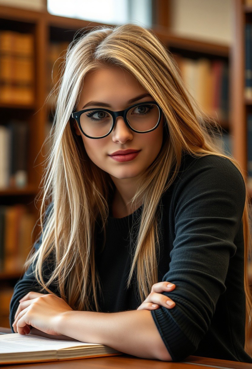 Create a highly detailed and visually stunning photograph of a beautiful 21 year old female, with a very slim and athletic build. She is beautiful, but doesn’t know it. Shy, nerdy, librarian, She is sitting behind a library desk, Her long blonde hair is styled elegantly. She is wearing dark rimmed glasses. She notices the viewer staring and is glancing shyly at the viewer and blushing profusely.