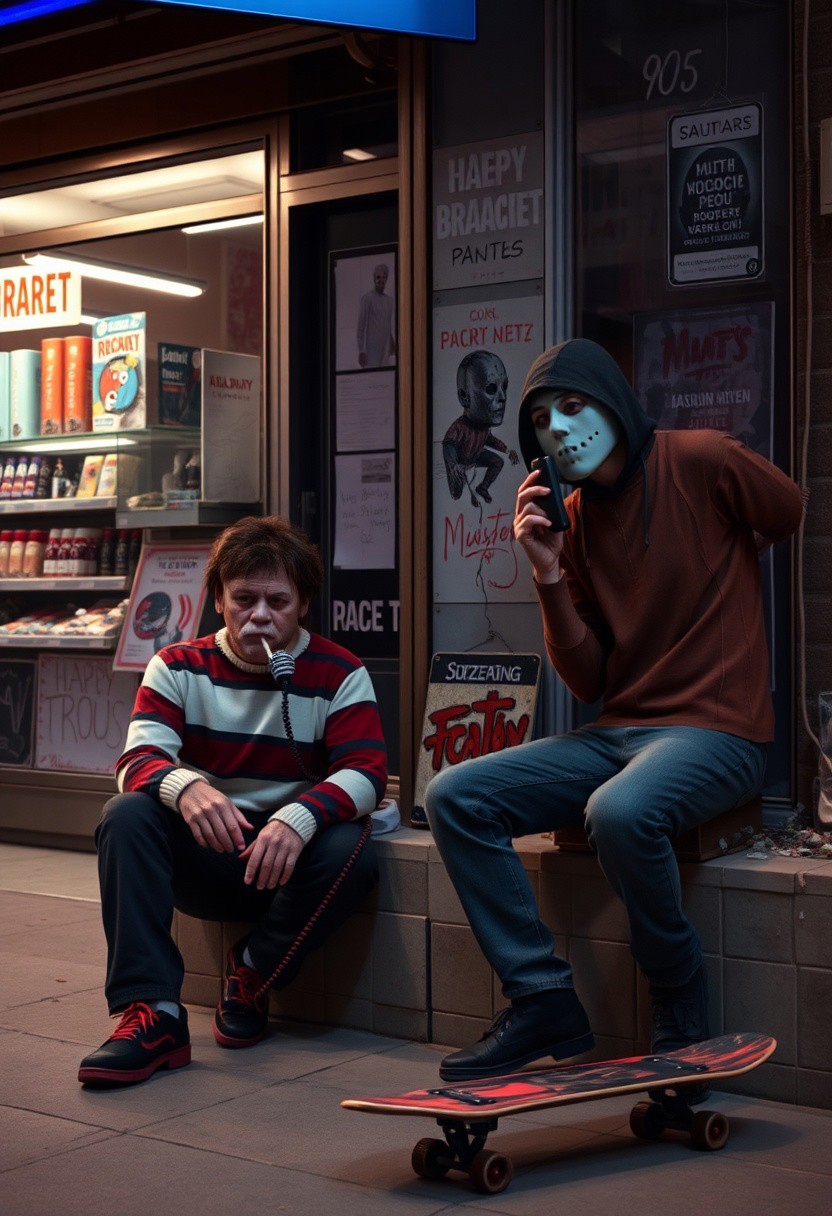 outside a minimarket, 20 years old Freddy Krueger smoking a cigarrette sitting on the sidewalk, 18 years old jason voorhees watching her telephone, 21 years old michael myers on a skateboard doing tricks