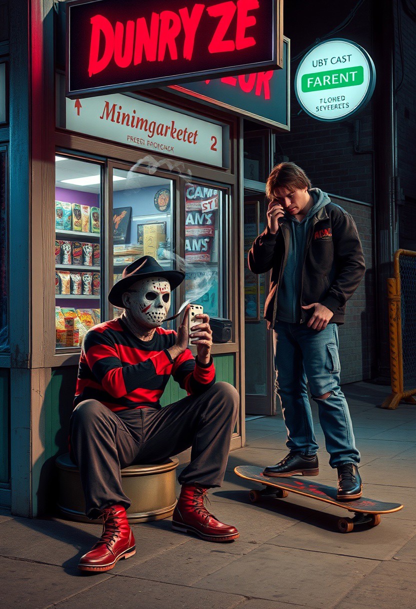 outside a minimarket, 20 years old Freddy Krueger smoking a cigarrette sitting on the sidewalk, 18 years old jason voorhees watching her telephone, 21 years old michael myers on a skateboard doing tricks