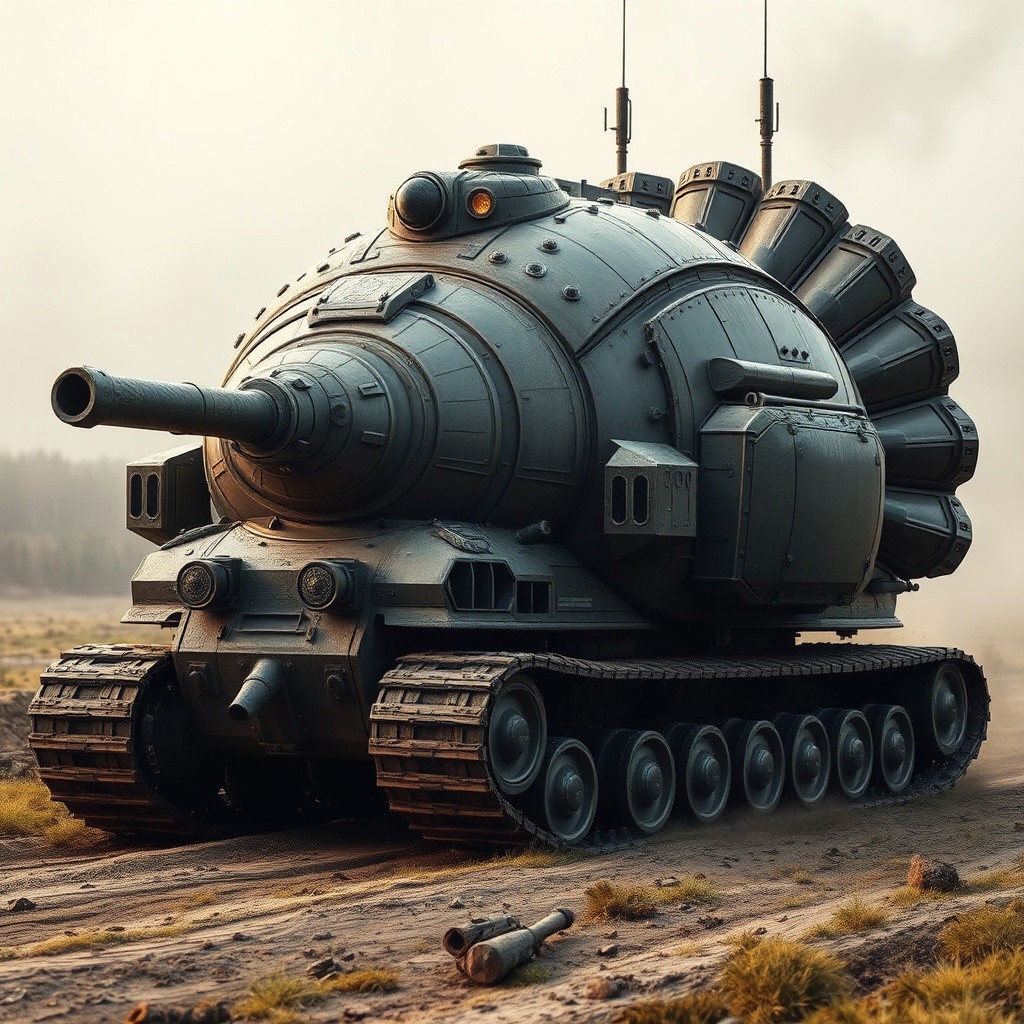 A formidable tank designed to resemble a massive turkey rolls across the battlefield. The body of the tank is heavily armored, with its turret shaped like the rounded torso of a turkey, covered in thick, metal "feathers" that provide both protection and a menacing look. The front of the tank features a sharp, beak-like cannon, capable of firing high-powered shells, while smaller weapons are mounted along the sides, where mechanical "wings" fan out to shield the vehicle. The tracks, disguised as powerful, clawed feet, dig into the ground as the tank advances, leaving deep impressions behind. At the top, the rotating turret mimics the turkey’s head, with small, glowing yellow "eyes" scanning the surroundings for threats. The tank's exhaust pipes extend from the rear, giving the impression of tail feathers as they spew smoke. Despite its comical shape, this turkey-inspired war machine exudes an intimidating presence on the battlefield.