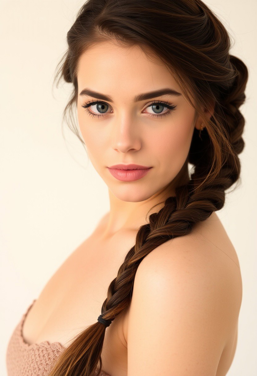rigurous front view of a brown haired beautiful woman, long braid over the shoulder side