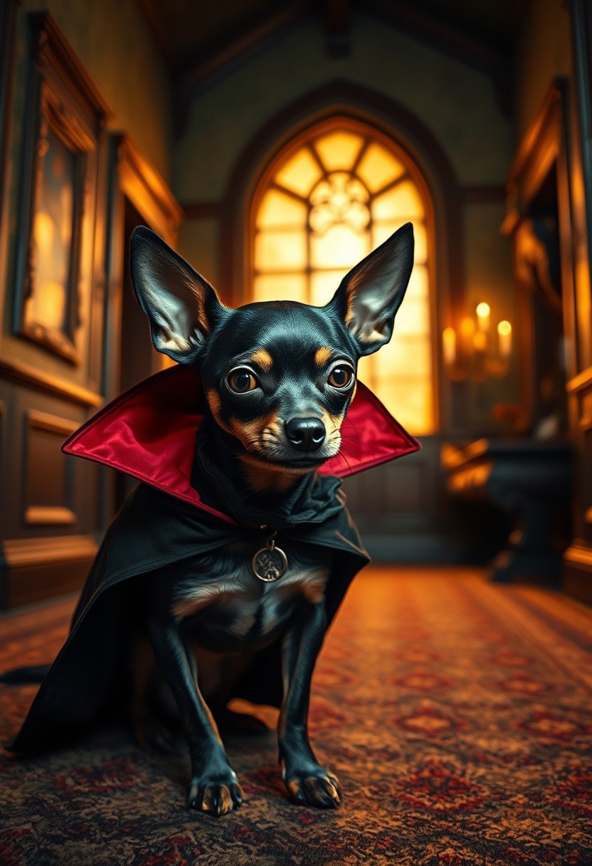 The Vampire Miniature Pinscher roaming in an old mansion, Shy Miniature Pinscher. really cute vampire. Creepy ambiance. Wearing a old cape. Sharp teeth