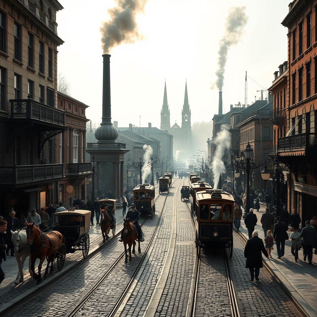 In the heart of industrial-era city center, the morning unfolds with a delicate balance of chaos and romance. The cobblestone streets are alive with activity as horse-drawn carriages, their wheels clattering, weave through the bustling crowd. Alongside them, steam-powered trams glide through the middle of the street, hissing with mechanical power, blending tradition with the rise of technology. The soft morning light bathes the scene, casting a cinematic glow on the weathered facades of iron and stone buildings, towering smokestacks puffing dark smoke into the sky. The intricate wrought-iron railings and gas-lit street lamps add an air of timelessness to the busy atmosphere. Pedestrians hurry along the sidewalks, their footsteps echoing off the cobblestones as the trams clang and whir through the city. The scene feels vibrant yet weighed down by the sense of industrial progress, reflecting the evolving spirit of Backlund. In the distance, a church bell tolls, completing the harmonious blend of mechanical rhythms and human movement that defines the pulse of the city. The angle captures the intricate details of the streets, from the steam rising from grates to the ornate street signs, infusing the moment with Lord of the Mysteries’ signature atmosphere of mystery and progress.