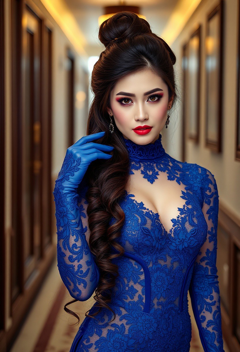 a gorgeous 30 years old asian woman, pale skin, very long brown hair in updo with curls hanging down, long black eyelashes, black mascara, black eyeliner, big brown eyes, red sparkling smokey eyes eyeshadow, luscious sensual pink glossy lips, rouge, sexy elegant curves, blue elegant lace choker, long blue lace gloves, long blue lace dress with cleavage and side slit, blue stockings, looking at viewer sensually and dominantly, Oriental hallway