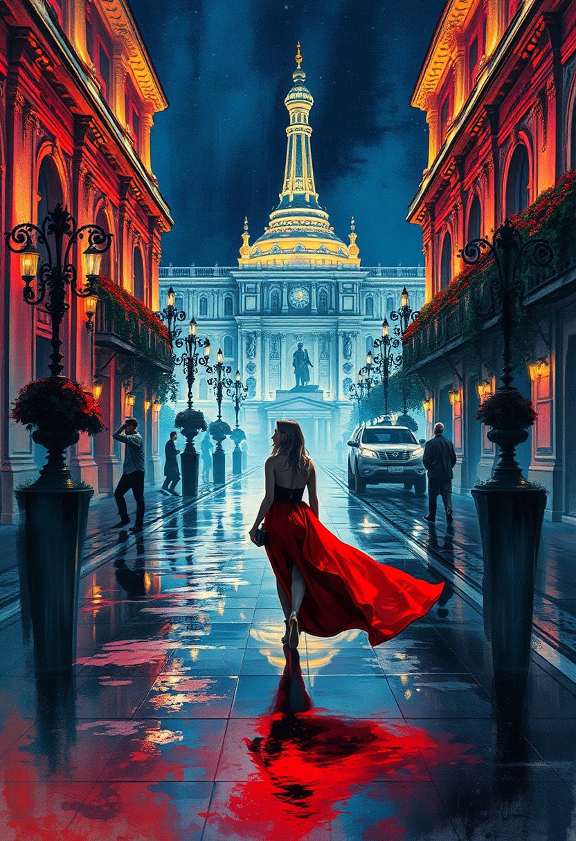The shot of a lady in red strolling down a grand promenade!!! Wet night time!!! Highly detailed watercolor poster art, UHD, centered composition, By Wadim Kashin, Beeple and Pino Daeni, photorealistic, hyperrealism, dramatic, mysterious, ethereal, mesmerizing atmosphere, extremely intricate, hyperdetailed, 8k resolution, masterpiece.