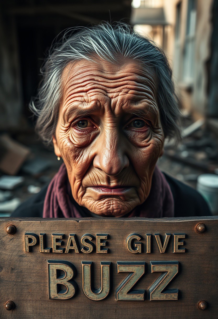 “An elderly woman with deeply wrinkled, weathered skin is captured in a close-up using a 50mm Panavision Prime lens, revealing every intricate detail of her face. Dramatic lighting casts heavy shadows, highlighting the sorrow and exhaustion etched into her features. Her eyes, full of suffering, speak to years of hardship. The background, softly blurred, suggests a decaying slum with crumbling walls and debris. At the lower part of the image, a cracked wooden panel with rusted nails holds bold, capital letters carved into the wood, reading ‘PLEASE GIVE ME BUZZ.’ The text, in a pastel color, blends with the wood grain, intensifying the gritty, distressed atmosphere, adding an ironic contrast to the somber mood.”