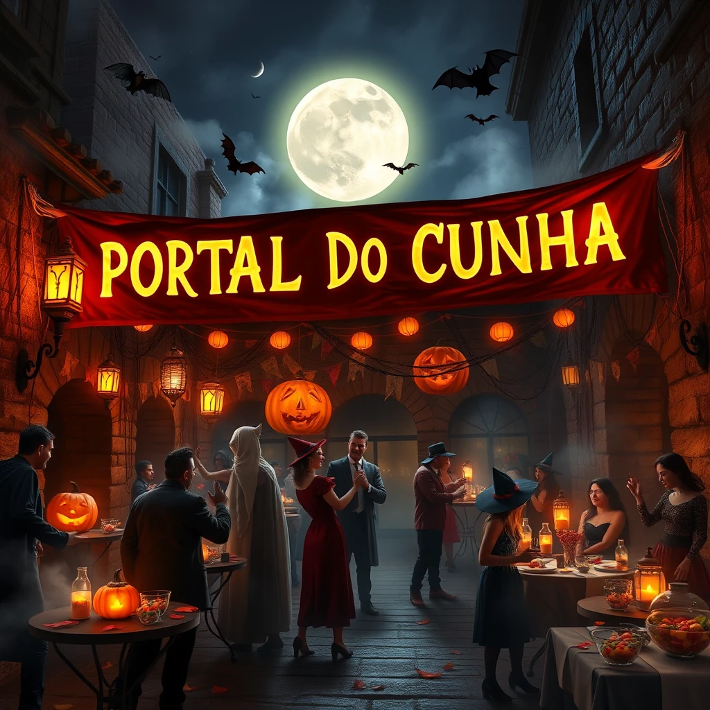 Halloween Party Banner Art – "PORTAL DO CUNHA" (Realistic Style): "A dynamic and lively Halloween party scene with lifelike decorations and people celebrating under dim, moody lighting. The banner displays 'PORTAL DO CUNHA' in bold, glowing text, written in an elegant, eerie font, surrounded by soft fog and shimmering lights. The atmosphere blends spooky and festive elements: realistic carved pumpkins emitting warm candlelight, cobwebs stretching across the corners, and flickering lanterns swaying gently above the crowd. Partygoers wear detailed costumes such as vampires, witches, and ghosts, interacting with the environment in joyful moments of dance, laughter, and conversation. The scene takes place in an outdoor courtyard or rustic street, with stone walls and tables decorated with candy bowls, potions, and haunted-themed snacks. Small bats fly overhead as autumn leaves scatter along the ground. The glowing moon looms large in the sky, casting subtle silver highlights over every detail. The environment is richly textured, with crisp, vibrant decorations balanced by atmospheric fog and shadows, enhancing the festive yet mysterious ambiance." Style Elements: "(extremely detailed CG unity 8k wallpaper, masterpiece, best quality, realistic, lifelike decorations, cinematic lighting, glowing text effects, intricate fog, perfect composition, festive and spooky atmosphere, highly detailed costumes, dynamic lighting reflections, soft shadows, intricate textures)" This version integrates realism with festive Halloween charm, ensuring the banner is visually rich, immersive, and conveys both eerie and joyful elements for the perfect Halloween-themed art.