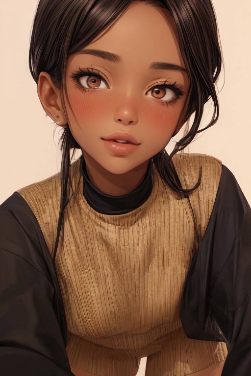 (masterpiece), best quality, expressive eyes, perfect face, stunning eyes, sparkling eyes, upper body of an 18 year old girl, (((young face))), kawaii face, she wearing an outrageous pastel coloured outfit with heavy makeup, choker, she has a very dark tan, almost orange fake tan, golden skin, muscular legs, small breasts, small nipples, hard nipples, submissive, full face blush, perfect teeth, detailed and busy background, bhands