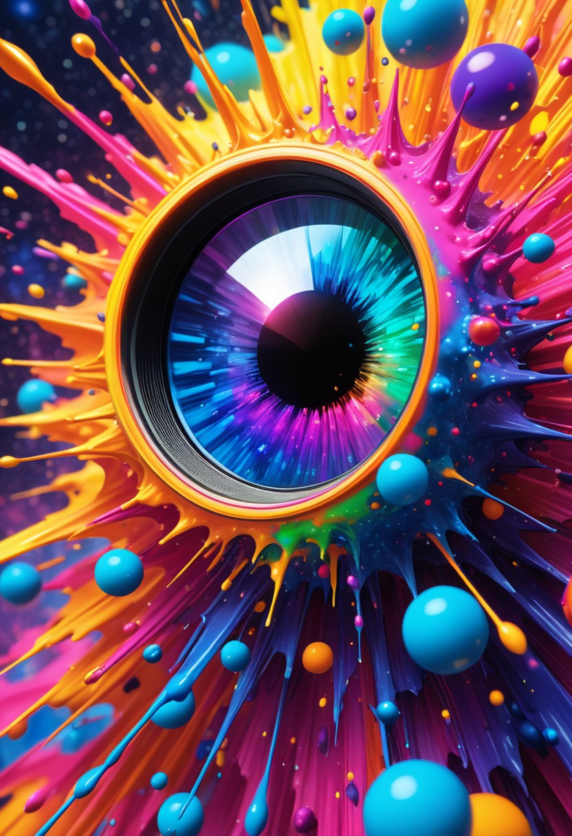 ink splatter, ultra-precise photography, DayGlo colors, celestial pilgrims, macro lens, grainy texture background, lens flare abuse, surreal, hyper-realism, vibrant, cinematic, futuristic, detailed, sharp, soft contrast, resplendent